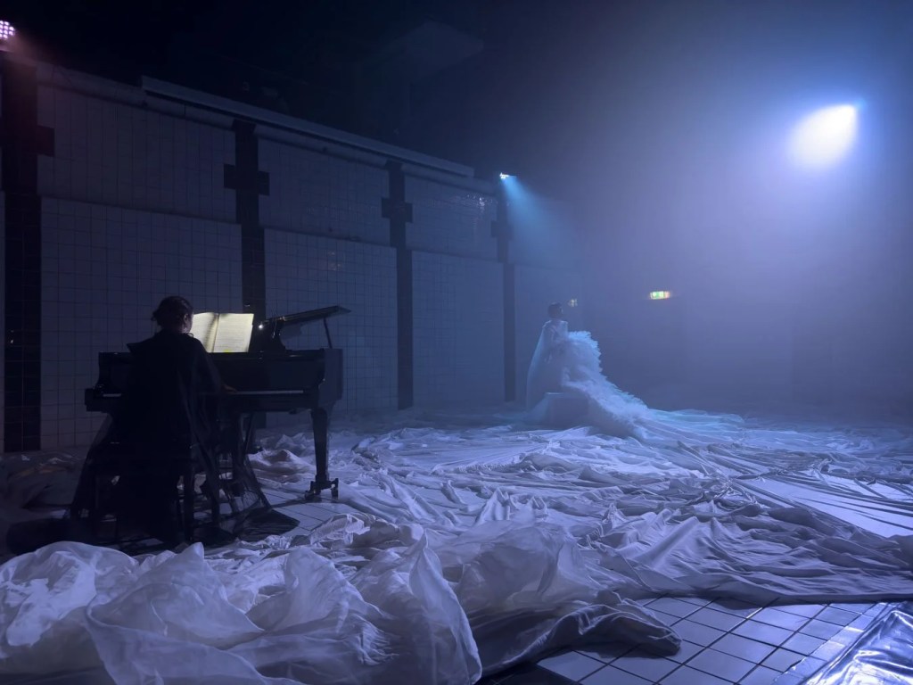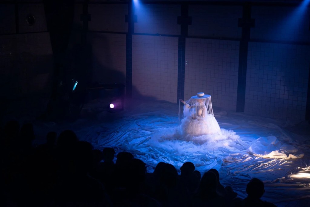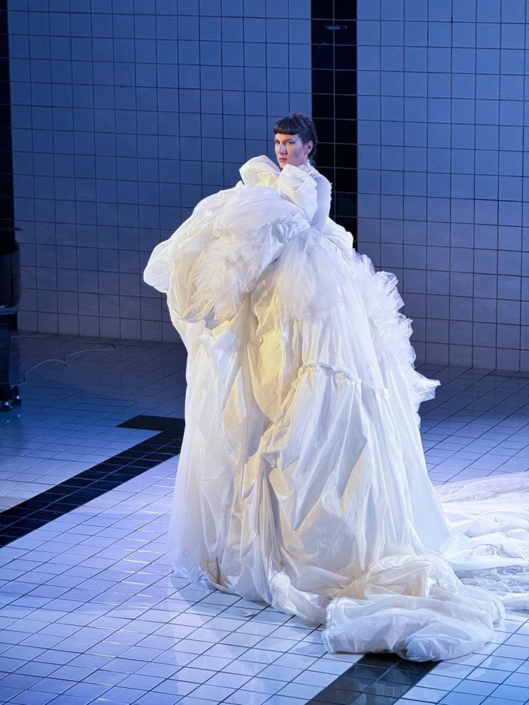 Zentrum steht ein bühnendeckendes weisses Kleid – Bühne, Kostüm