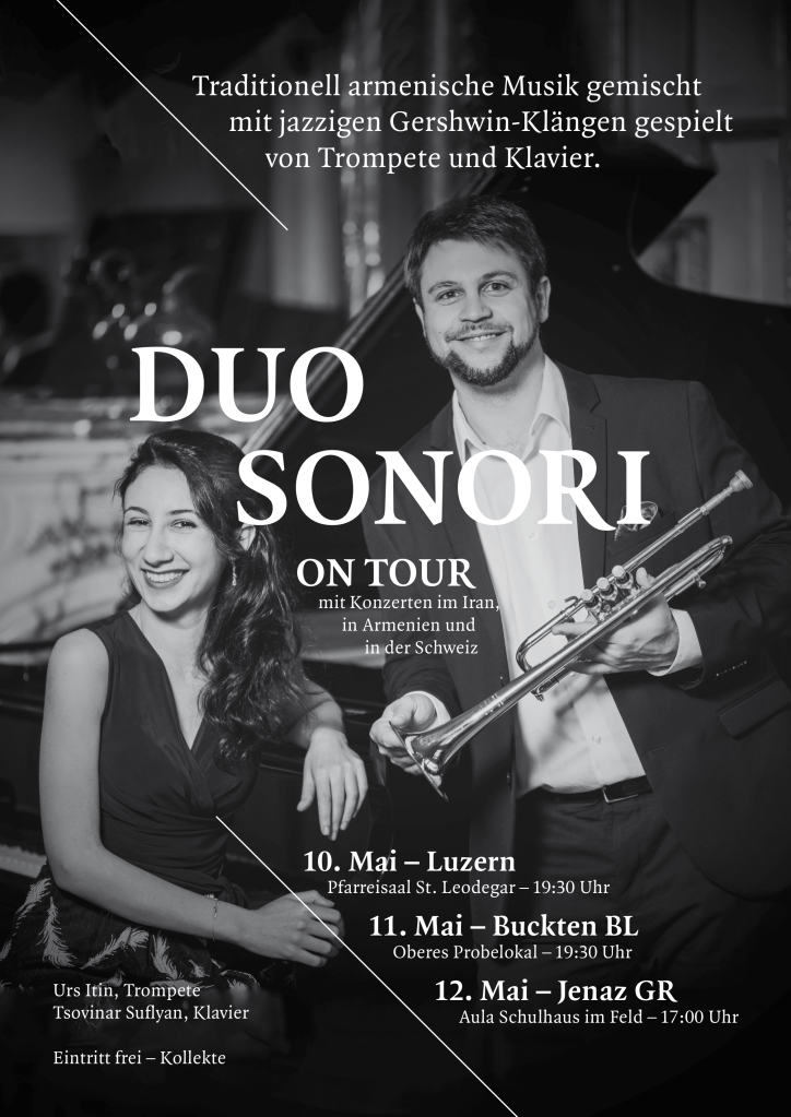 Im Zuge dieses Projekts werden wir eine Konzertreise nach Armenien und in den Iran unternehmen und wurden eingeladen, im Iran zwei Konzerte in Gedenken an den armenischen Völkermord zu geben. Dies stellte für uns eine grosse Ehre dar, welcher wir sehr gerne nachkommen werden. Auch in der Hauptstadt Jerewan, dem Geburtstort von Tsovinar Suflyan, werden wir ein Konzert zum Besten geben.
